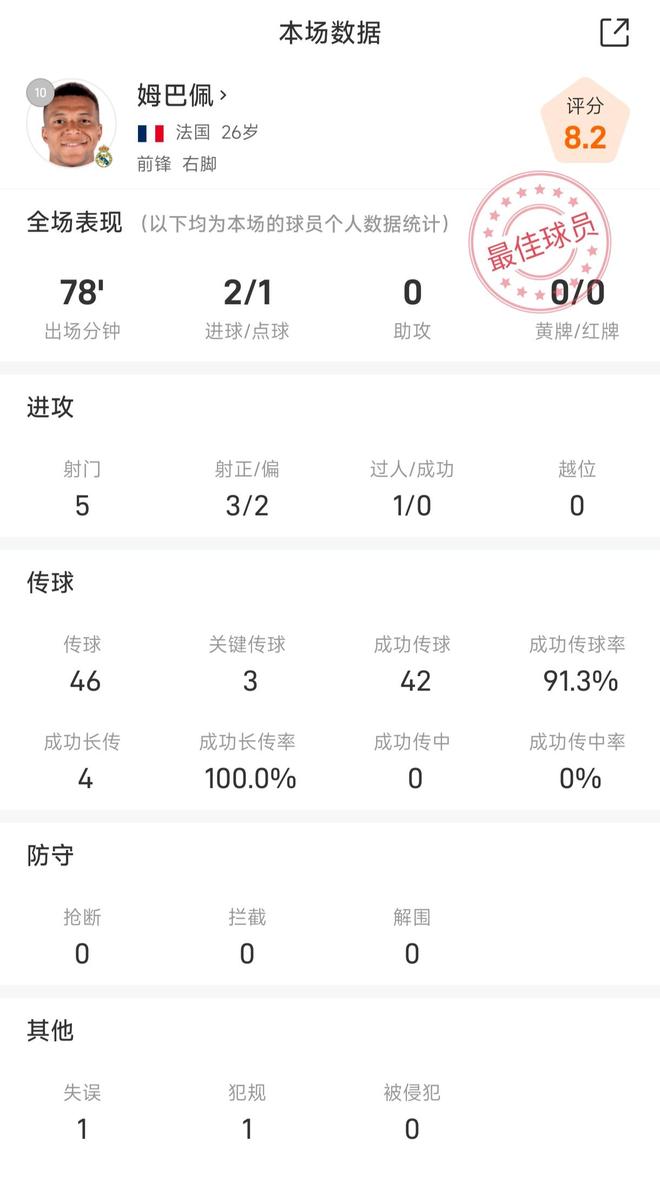 姆巴佩战瓦伦全场数据: